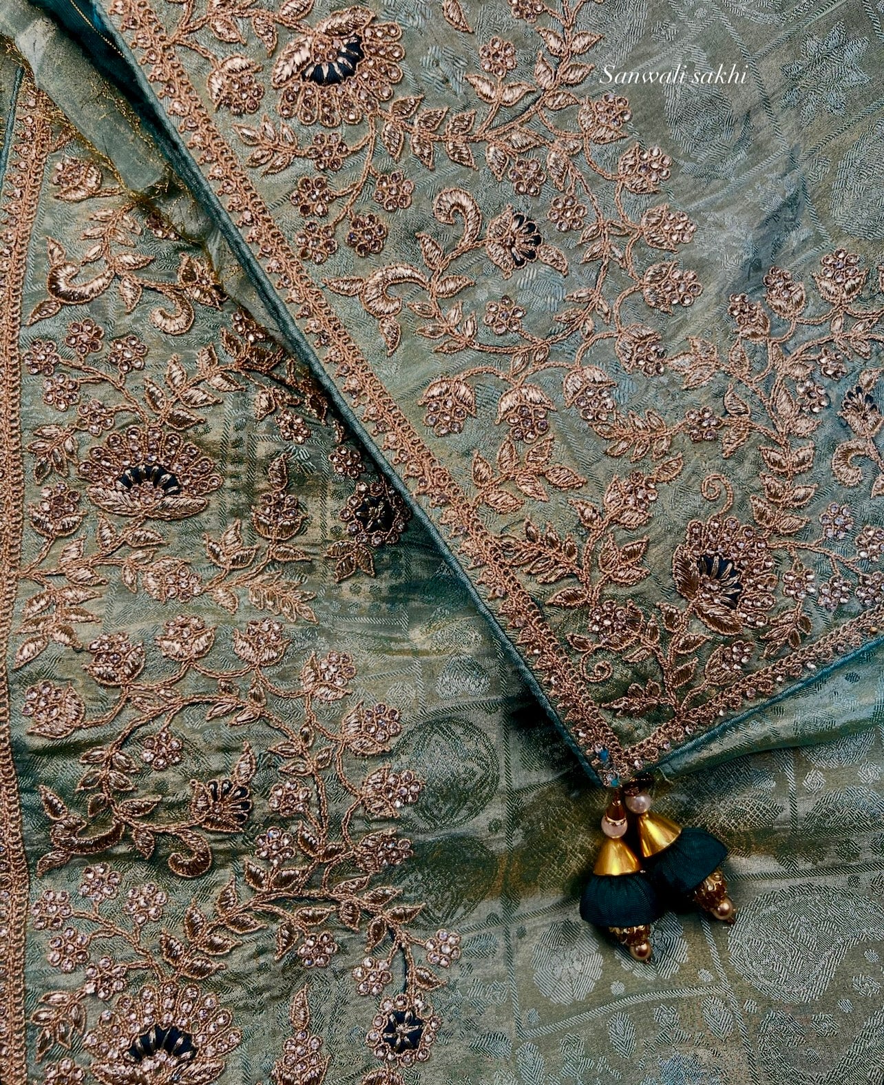 • Intricate gold thread embroidery with artistic floral motifs and turquoise accents