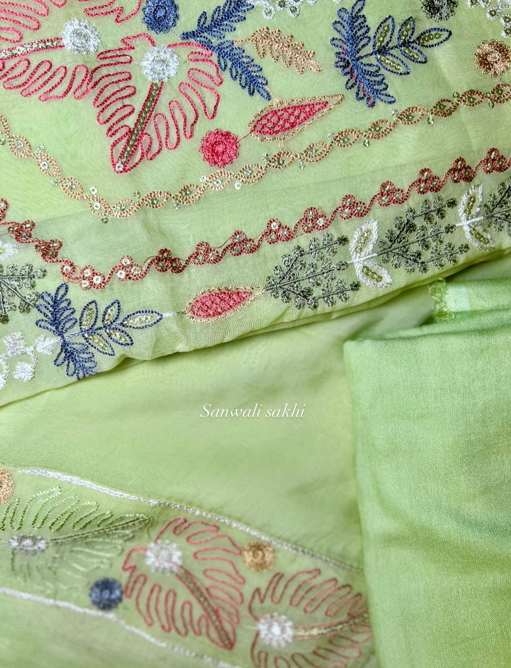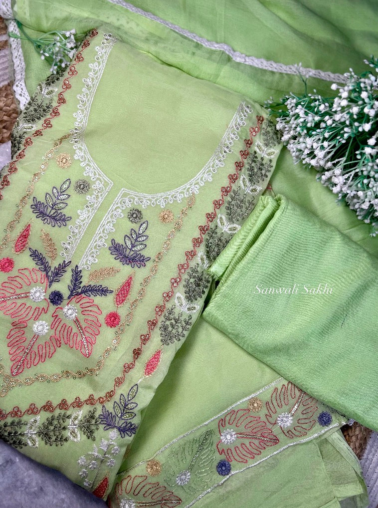Introducing our newest embroidered suit, featuring a beautifully crafted suit adorned with intricate multi-thread embroidery in soothing pastel tones. The soft pastel green color brings a fresh and elegant summer charm, while the delicately embroidered neckline adds a refined touch. Paired with a matching bottom and a lightweight embroidered dupatta, this ensemble creates a graceful and polished look. Ideal for festive gatherings and smart casual outings, it offers a confident yet soft and feminine appearance, designed for comfort in beautiful summer-friendly shades.