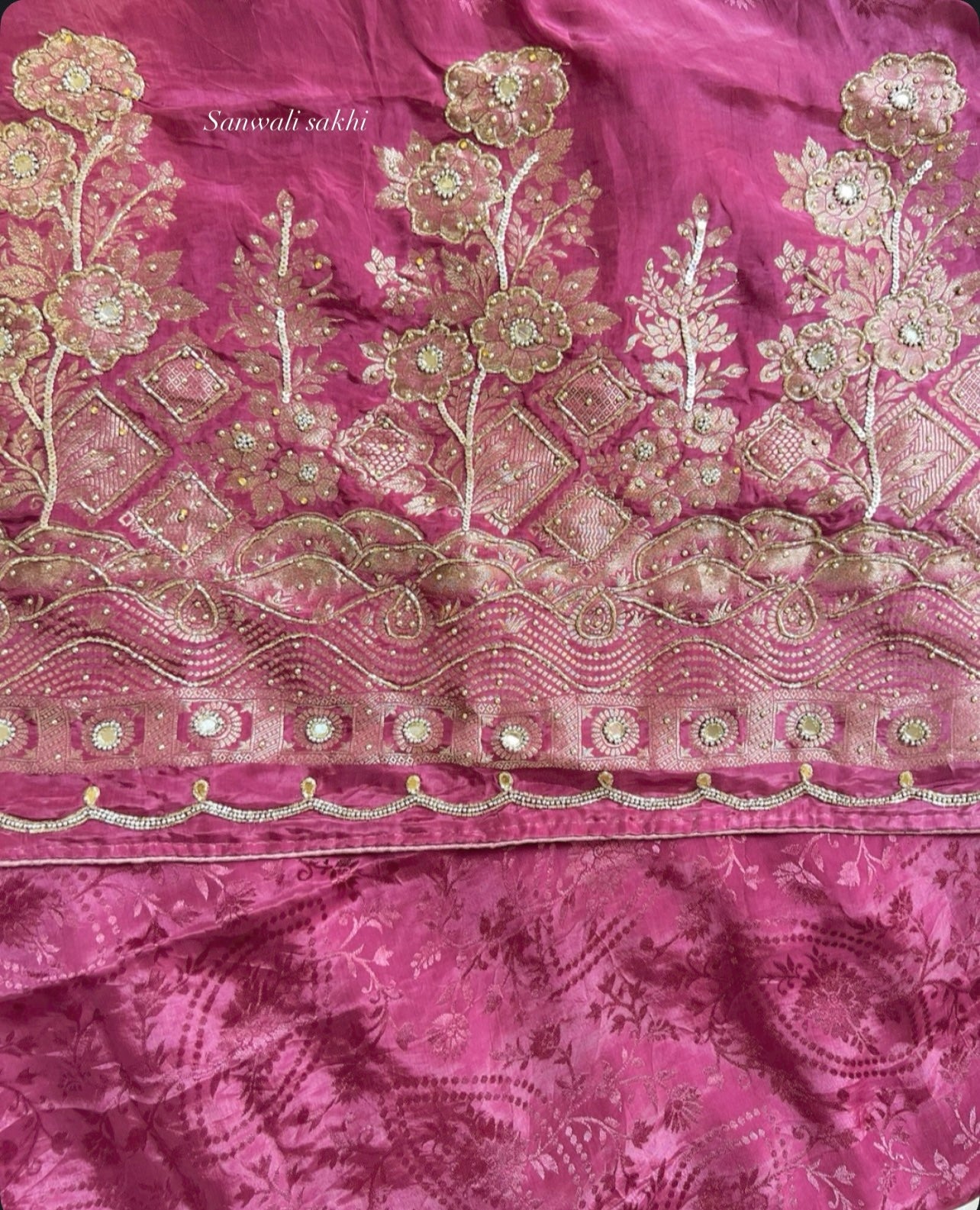 Crafted in a luxurious self jacquard silk fabric, this saree is a celebration of fine craftsmanship and timeless elegance. Each jacquard motif is beautifully embellished with delicate katdana and sequin handwork, adding a subtle sparkle and rich texture to the weave.